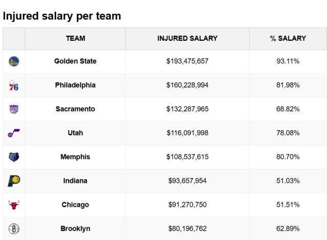 根据统计,勇士受伤球员的总薪水已经高达1.93亿美元,占全队薪水的93.1%,联盟最高。他们今天派出的首发是波杰姆斯基、理查德、桑托斯、莱昂斯、波斯特,5人合计年薪不到1000万美元!