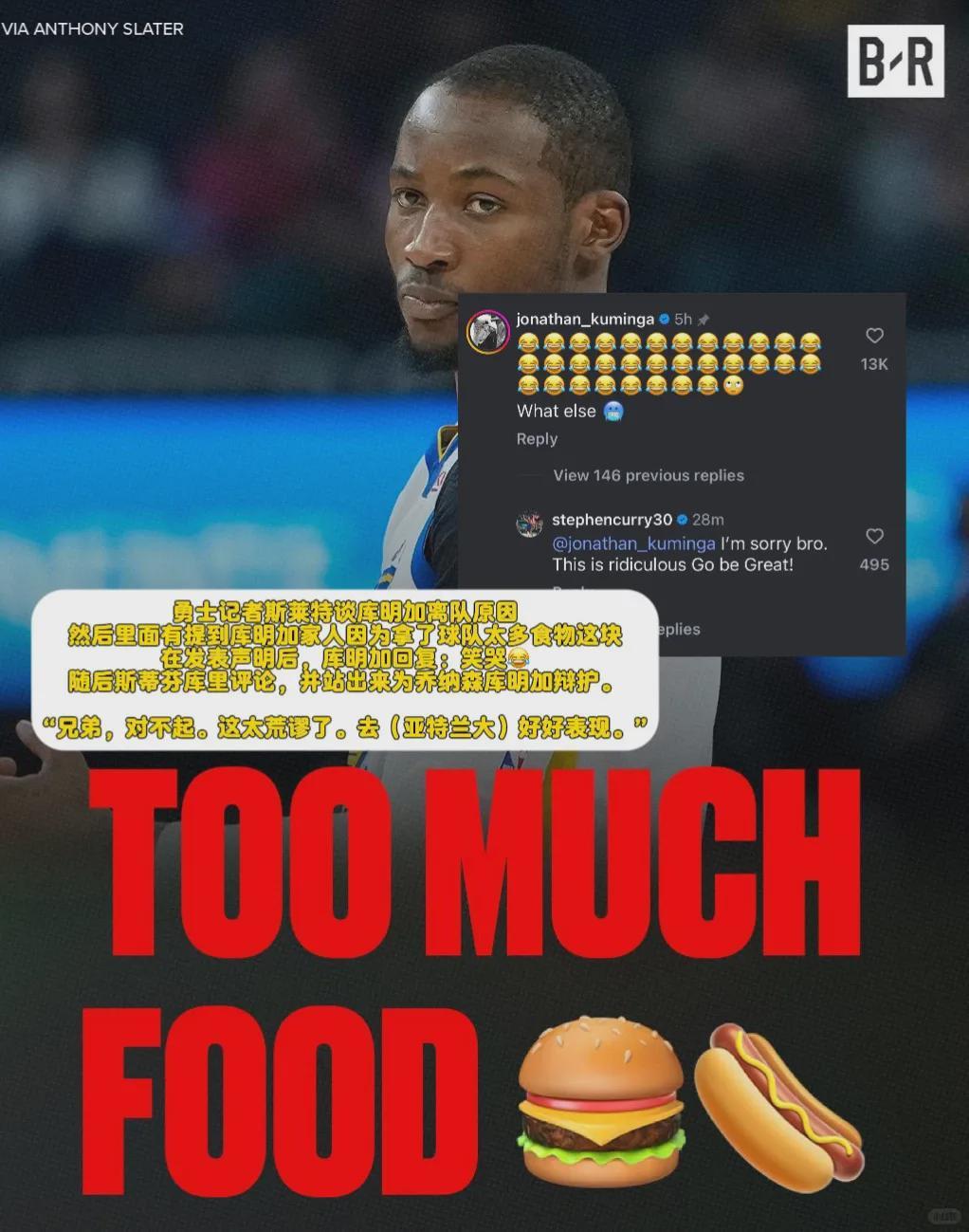 之前有媒体透露库明加的家属拿走了勇士的太多食物,库里对此直接辟谣:“对不起兄弟,太离谱了,去成为伟大吧!”
